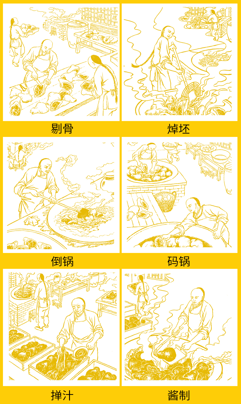 天福號醬肘子制作經過剔骨、焯坯、倒鍋、碼鍋、醬制、撣汁多道工序,過程煩瑣,僅醬制就需五六個小時,其間尤其講究人工對火候、時間的把握,只有15年以上從業(yè)者才能獨立操作。其制作技藝因“選料至精、工序繁瑣、工藝復雜、工具繁多”等特點納入《國家級非物質文化遺產》保護名錄。